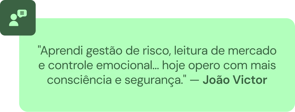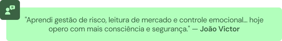 Antes do curso, eu operava no mercado mais na base da tentativa e erro. Achava que trade era só sorte. Durante o curso, aprendi a ter gestão de risco, leitura de mercado e controle emocional, que pra mim foi o mais importante. Hoje não digo que sei tudo, mas com certeza opero com muito mais consciência e segurança. Foi um divisor de águas na minha visão sobre o mercado financeiro.